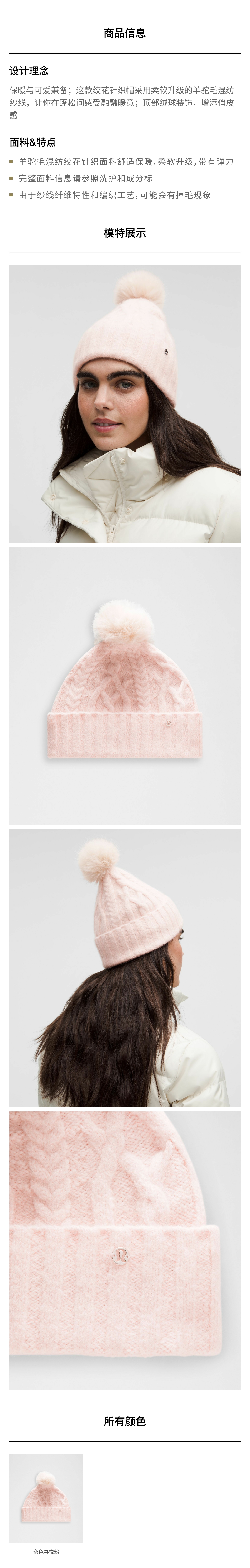 女士绒球绞花针织帽